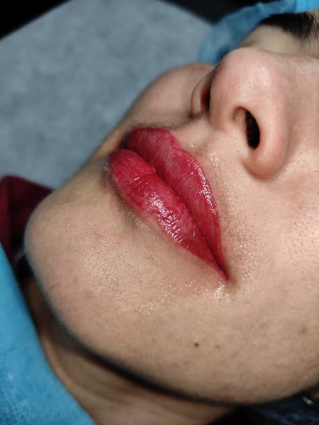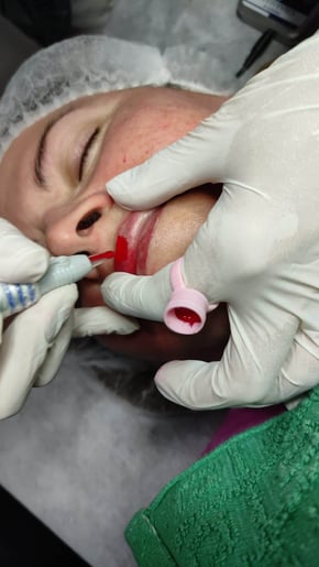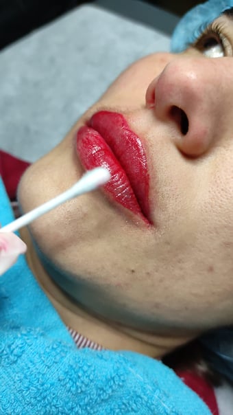 Técnica de maquillaje semipermanente para los labios. La llevamos a cabo con una aguja con la que realizamos pequeñas incisiones, mínimas, en las que vamos depositando el pigmento. Este proceso es indoloro ya que se utiliza anestesia tópica antes y durante el procedimiento.
